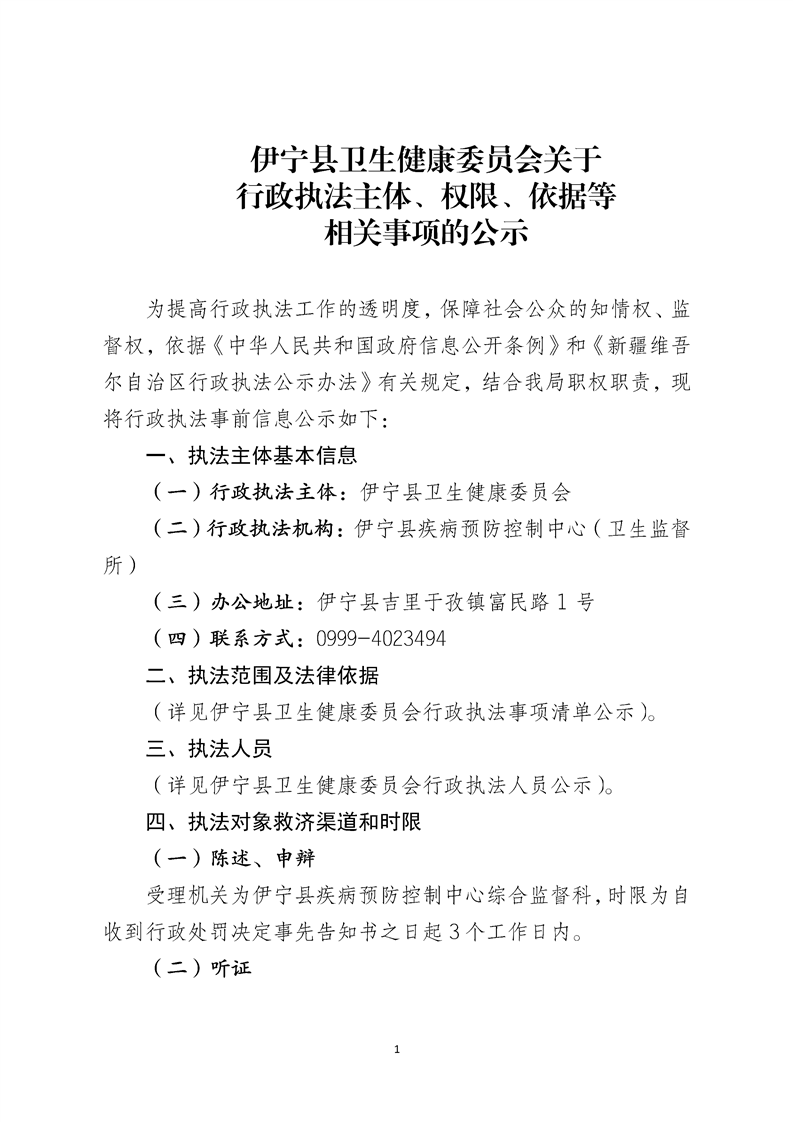 伊寧縣衛生健康委員會關于行政執法主體、權限、依據等相關事項
