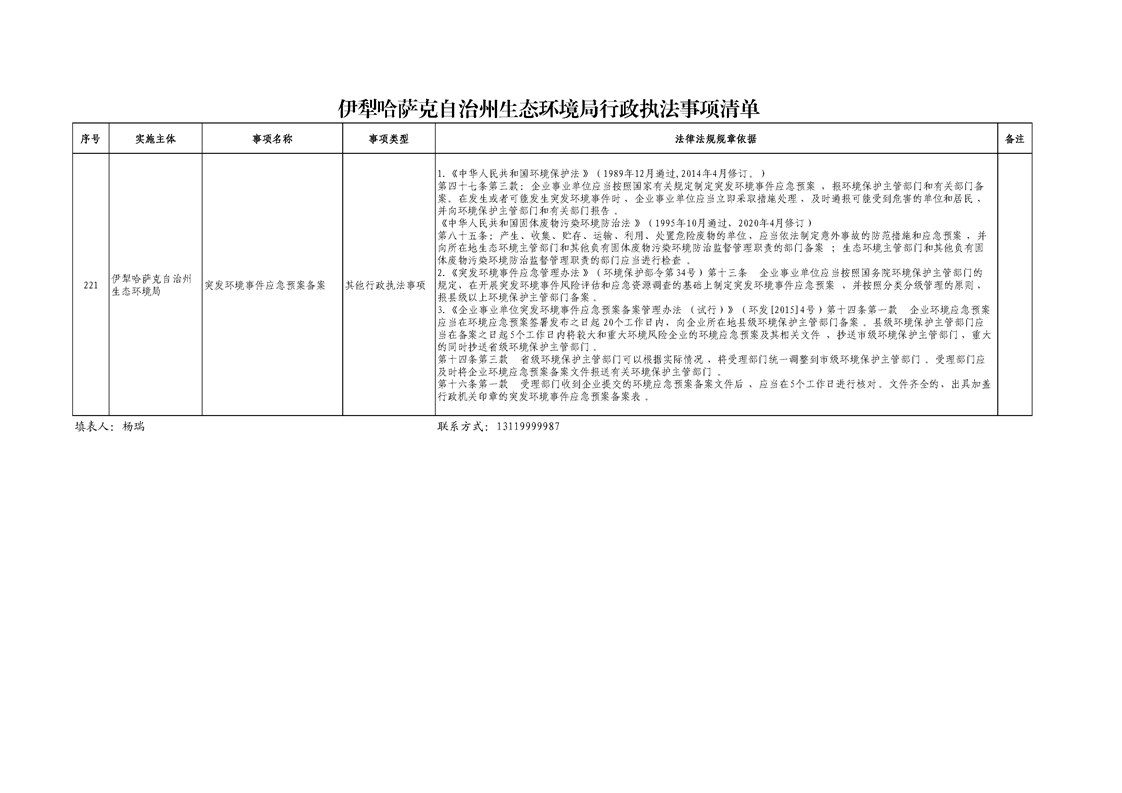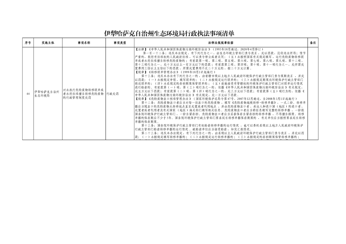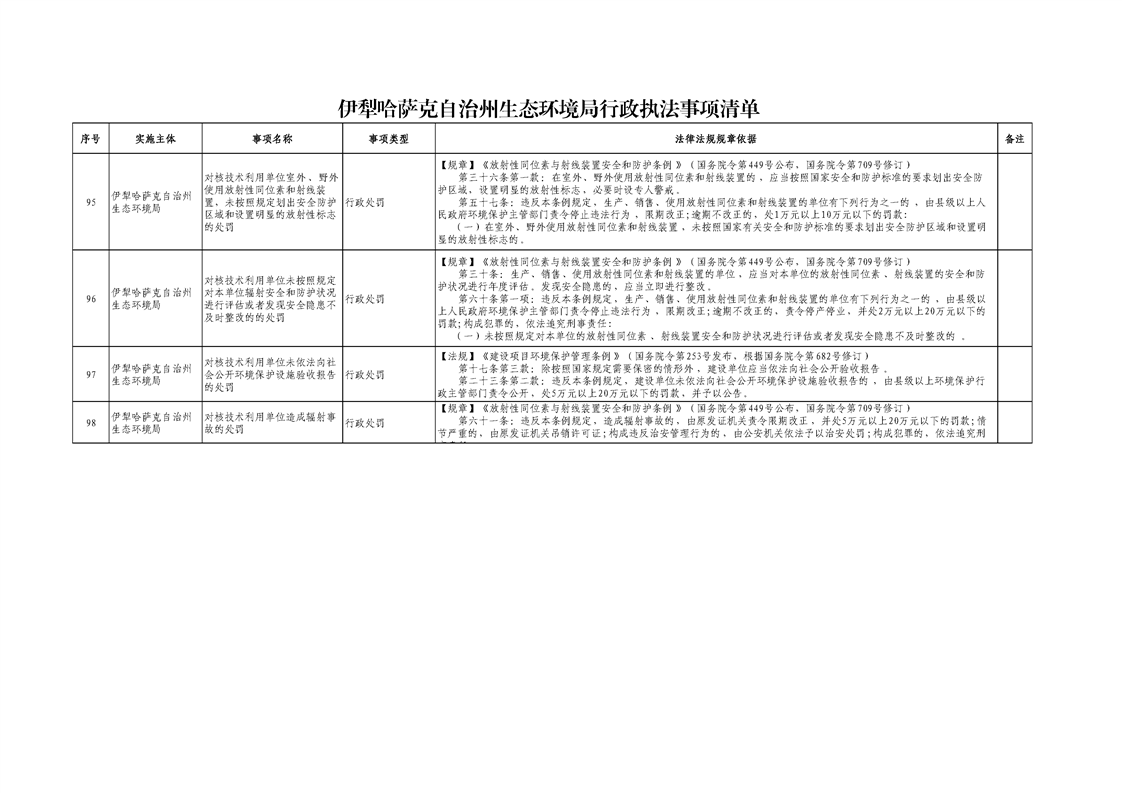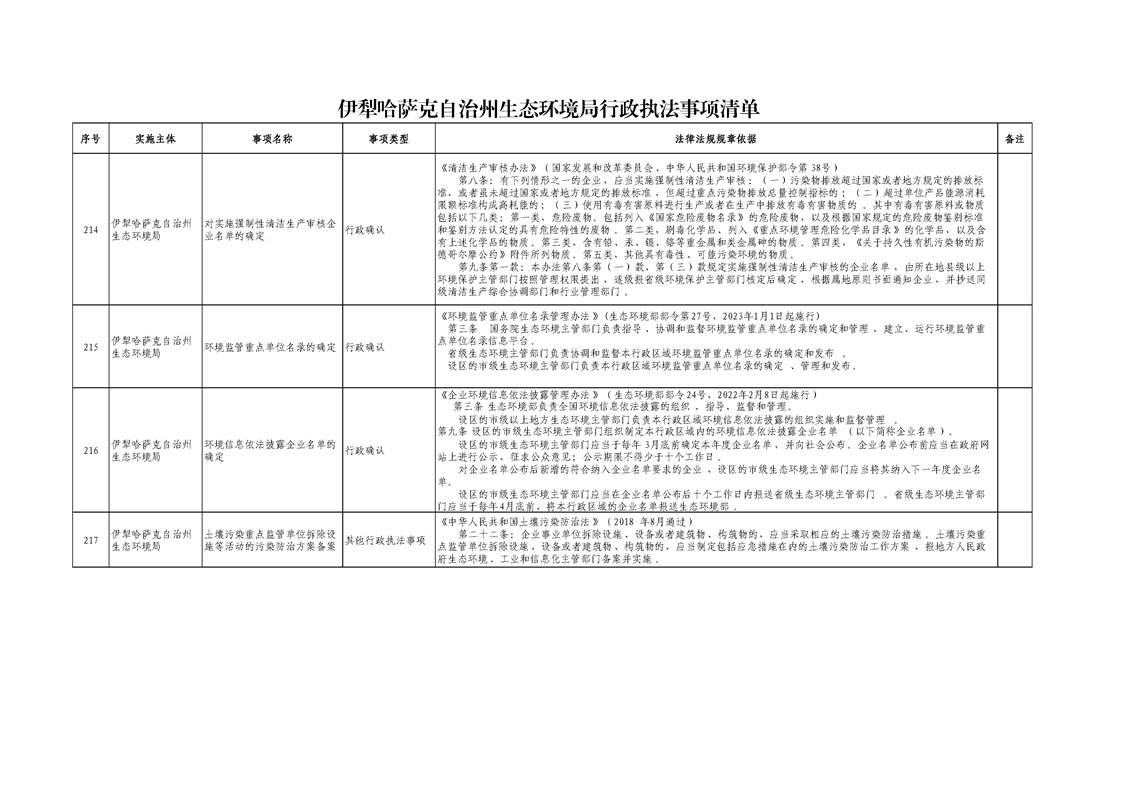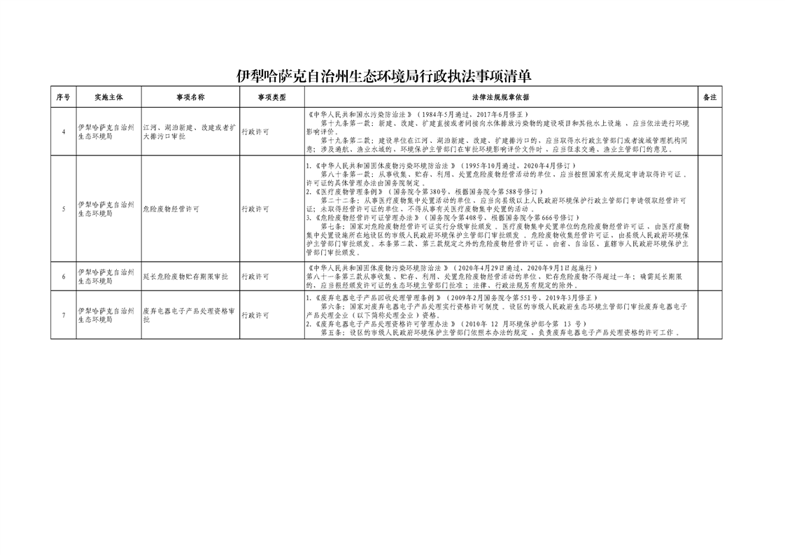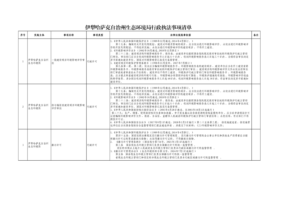 伊犁哈薩克自治州生態(tài)環(huán)境局行政執(zhí)法事項清單